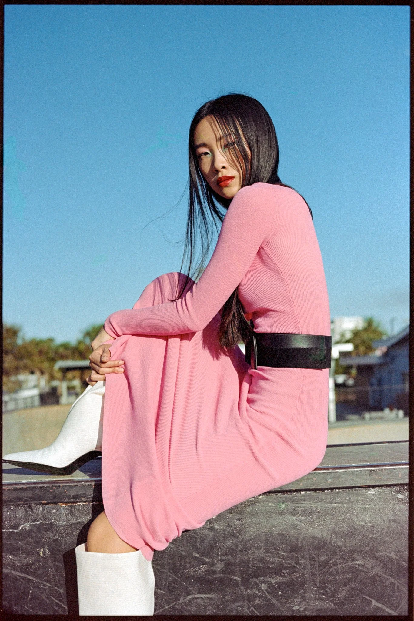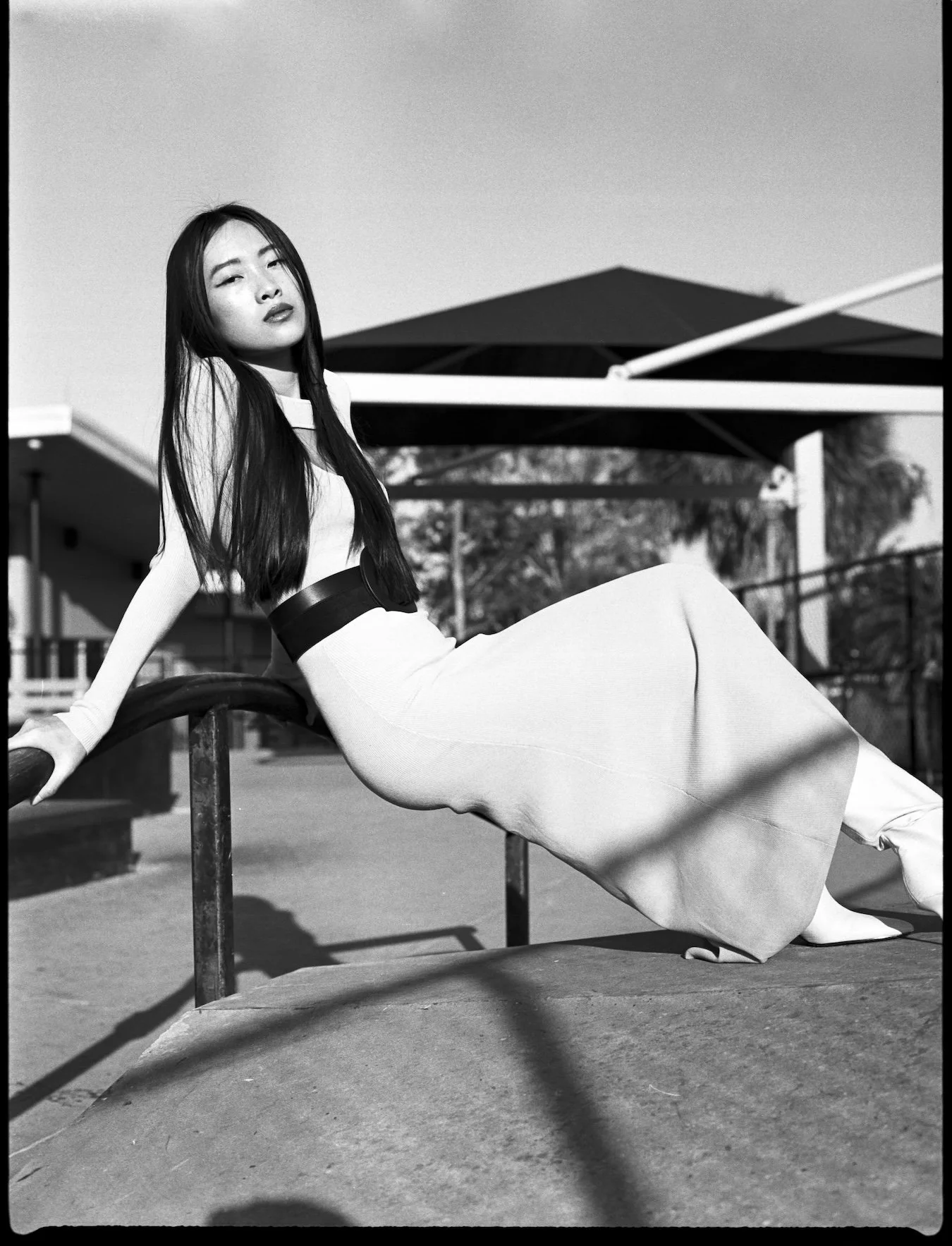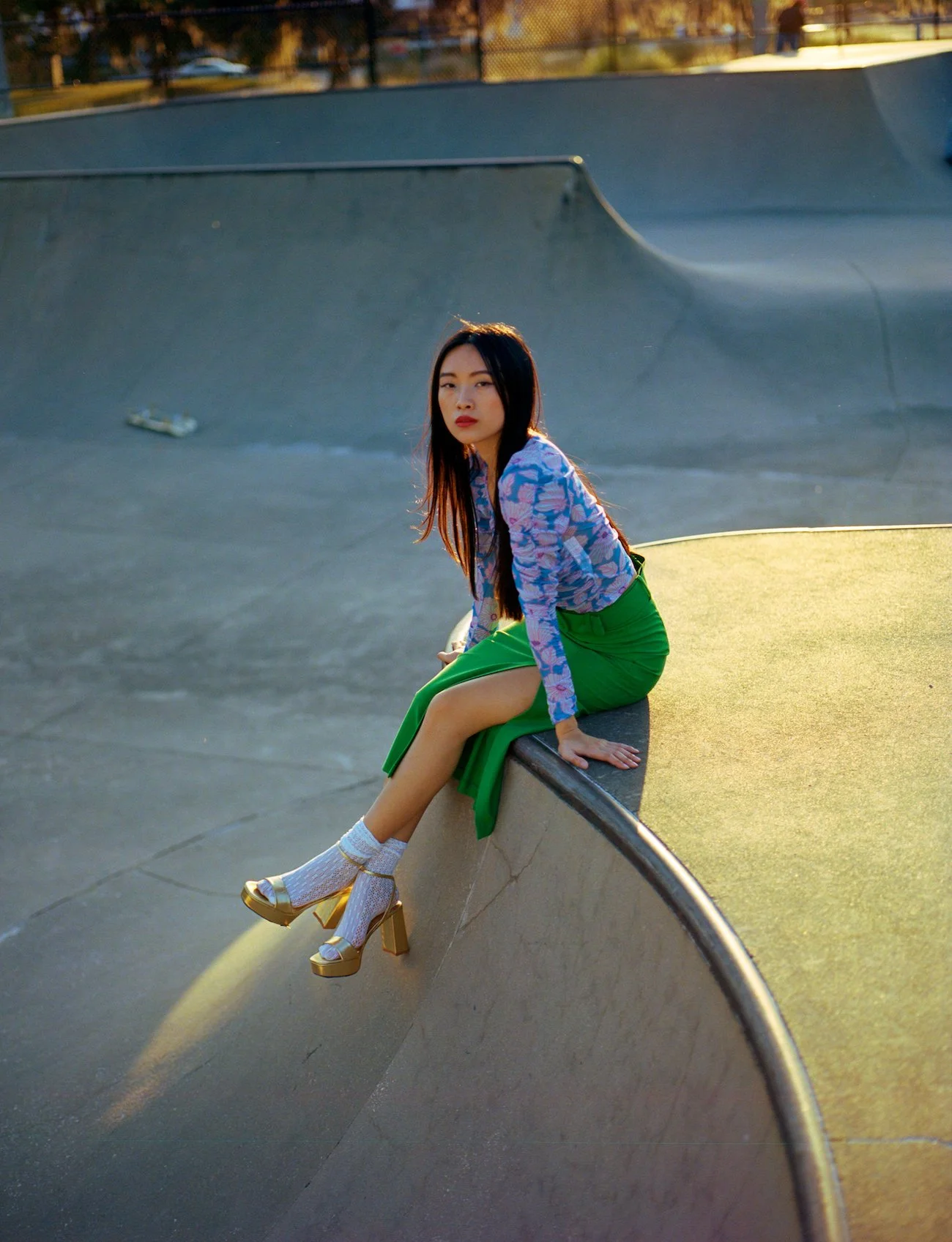 Boardwalk is an editorial shot on 120mm and 35mm film at a skate park in golden hour. We explored contrast: high fashion styling against raw concrete, warm film tones against urban geometry. The dynamic energy of the skate park gave the wardrobe an edge that a studio never could