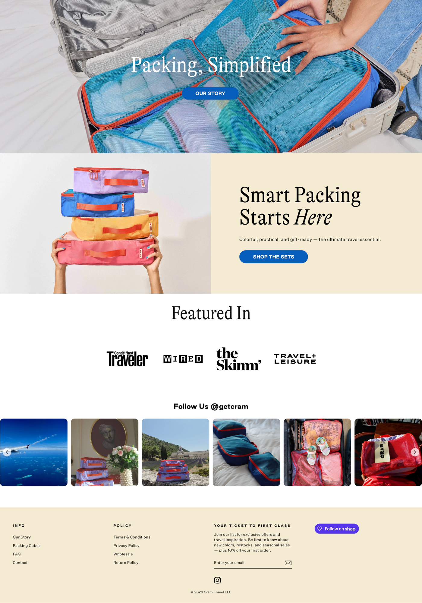 CRAM is a California-based travel accessories brand with a strong product and no strategic framework to match. We were brought in before launch to define the brand's positioning in a market dominated by Away, Béis, and Calpak, then built the social and influencer strategy to support it. From there, we produced all campaign and product photography for the ecommerce launch.