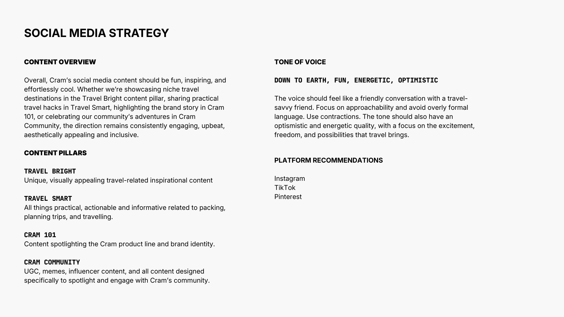 CRAM had a strong product but no strategic framework to stand out against Away, Baggu, and Béis. We started with the brand positioning and audience research, built a social strategy across three platforms, mapped an influencer program, then shot the campaign that brought it all together.