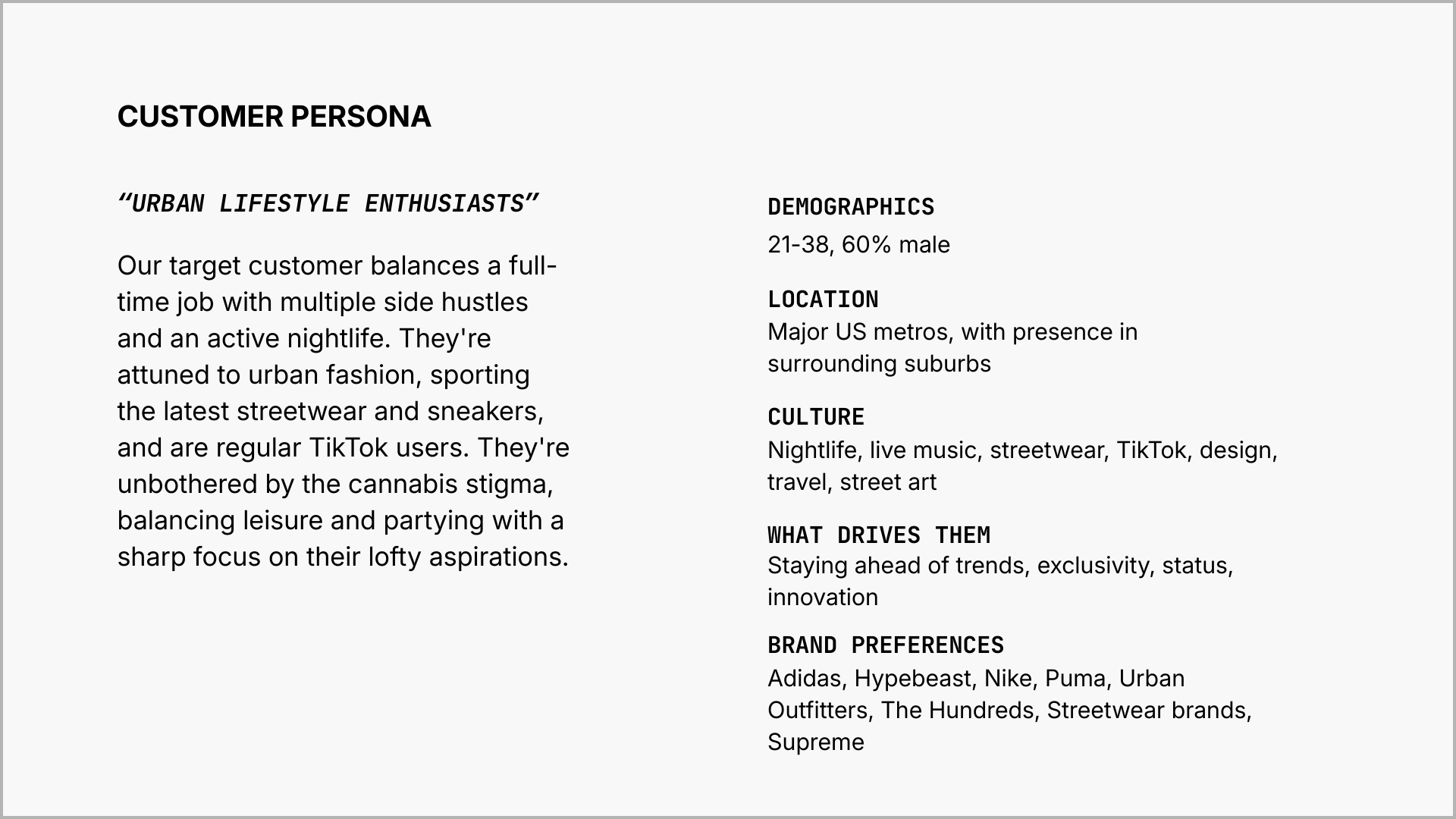 Working with the Project Slush team, we built a persona around their core audience — urban lifestyle enthusiasts balancing ambition and nightlife, attuned to streetwear, driven by status and exclusivity. That persona shaped every decision that followed: the visual concept, the casting choices, the styling, the lighting, and the tone of the video content. The result was a visual system that positioned Project Slush away from typical hemp aesthetics and toward the streetwear and culture brands their audience already follows.