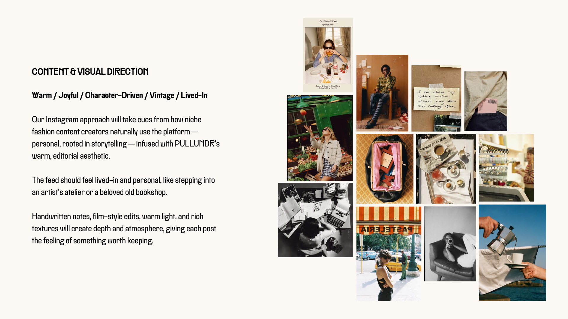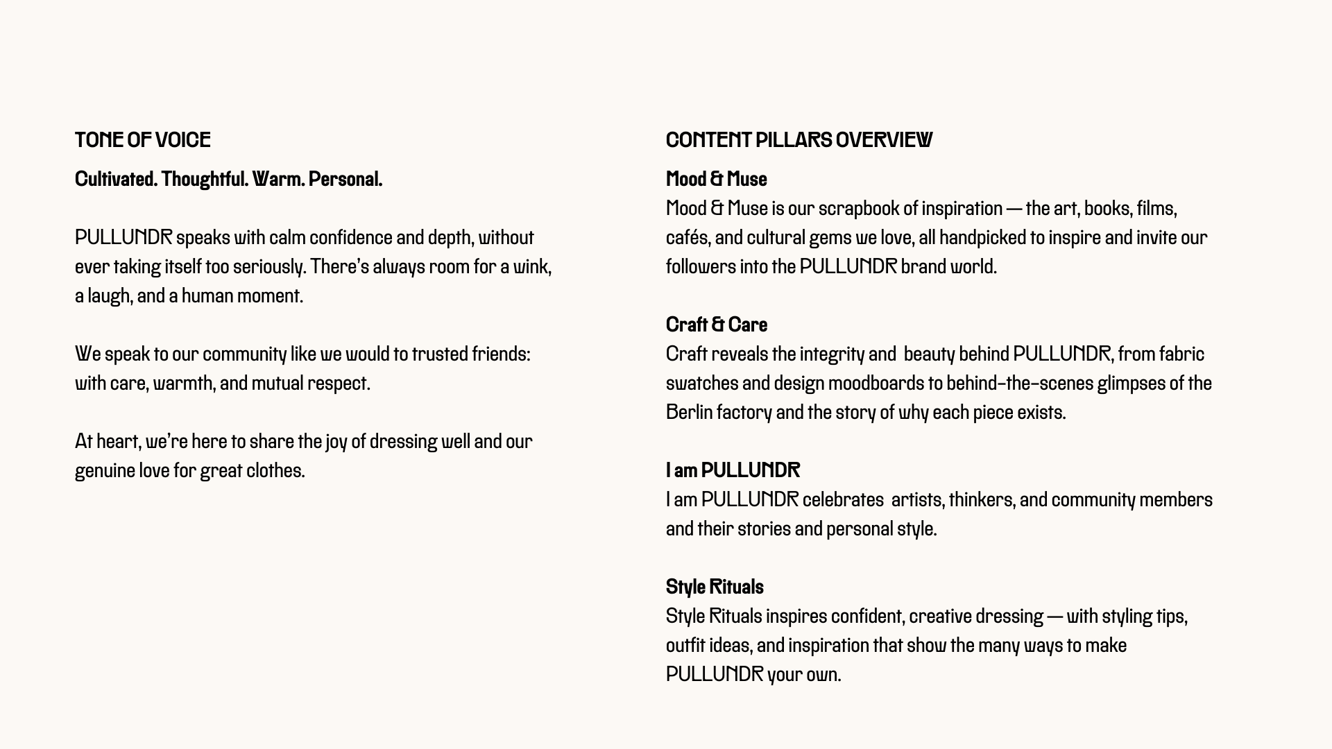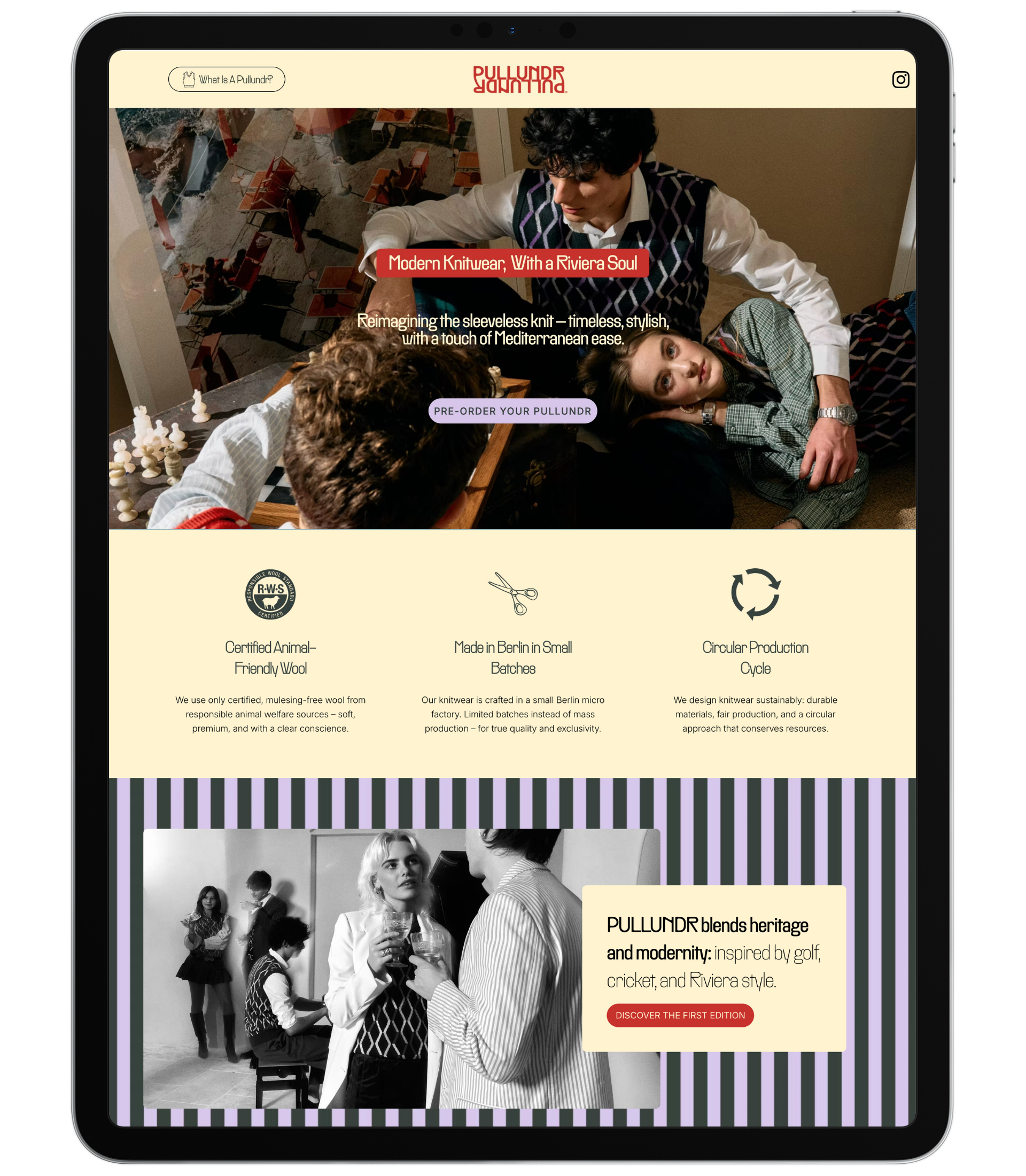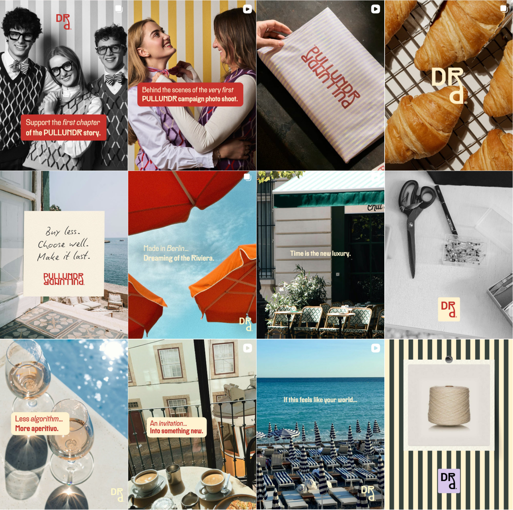 PULLUNDR is a premium knitwear brand built on modern heritage, slow fashion values, and a Riviera-infused visual identity. We were brought in before launch to shape the brand's entire digital foundation — translating its core values of craftsmanship, individuality, and timelessness into a cohesive world that people could immediately understand and connect with across web, social, and brand communications. We developed a four-part content system that turned the brand's editorial direction into a repeatable framework for Instagram, email, and ongoing storytelling.